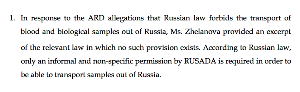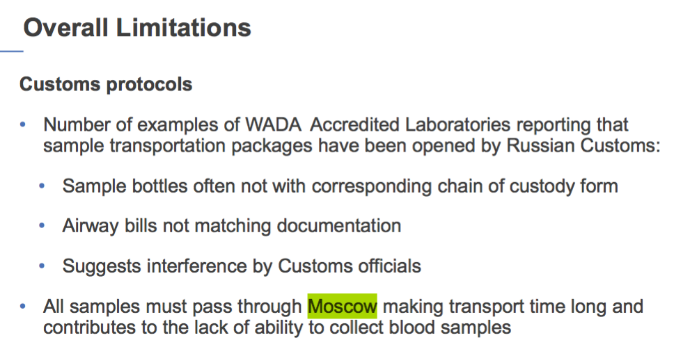 Interestingly, Natalia Zhelanova, advisor to the Minister of Sport in Russia and former Head of Anti-Doping within the Ministry of Sport, gave evidence to WADA’s Independent Commission that no law exists preventing the transport of blood and biological samples outside of Russia (p.265 of its first Report). Why, then, does WADA’s own evidence from 2016 find that ‘all samples must pass through Moscow’ and why did FINA require all Kazan 2015 samples to be analysed within Russia?