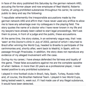 In the video, Dr. Alves also claims to have treated Brazilian FIFA World Cup winner Roberto Carlos to develop his muscles from the age of 15. It also features 200 pages of evidence on Dr. Alves that was passed to prosecutors, who in 2015 ordered a police investigation. Part of this evidence is an extract from an testimonial given by an athlete which names Carlos as having received treatment from Alves in 2002.