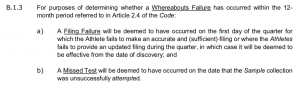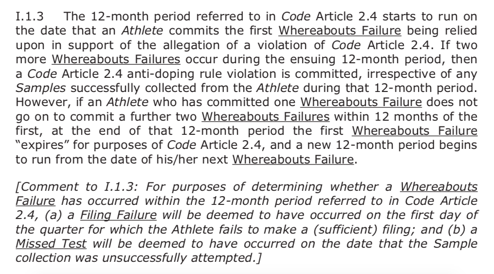 It is also important to recognise that such a ‘technicality’ is implicitly specified in anti-doping rules. A Comment on Annex I.1.3 of WADA’s International Standard for Testing and Investigations (ISTI – pictured, right) explains that for the purposes of determining whether a Whereabouts Failure has occurred, ‘a Filing Failure will be deemed to have occurred on the first day of the quarter for which the Athlete fails to make a (sufficient) filing’.