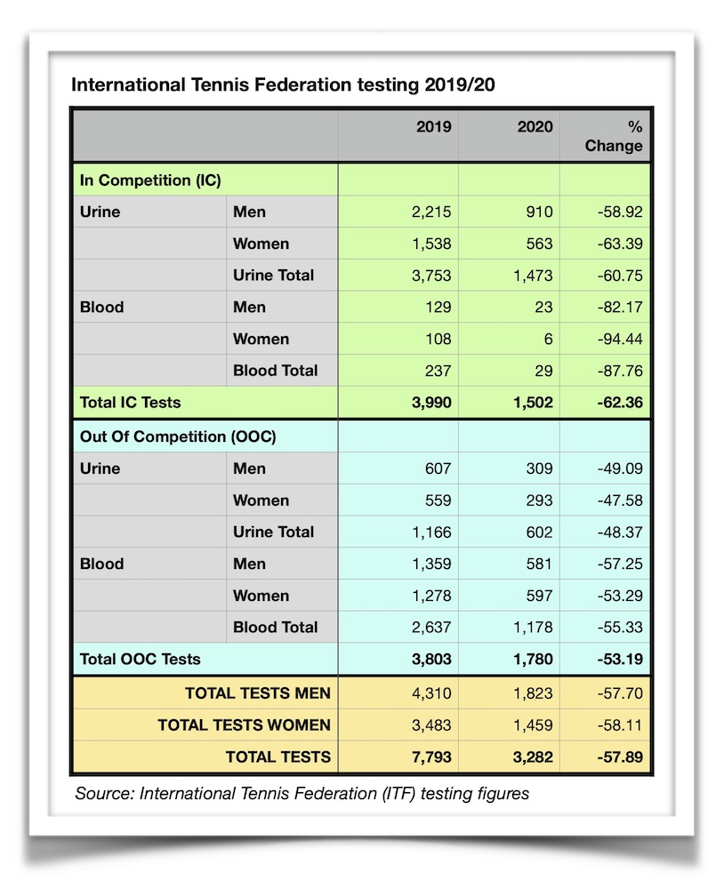 *This number is 20 more than the number reported in the ITF’s 2019 figures, due to its apparent minor miscalculation of the total number of out of competition blood tests.