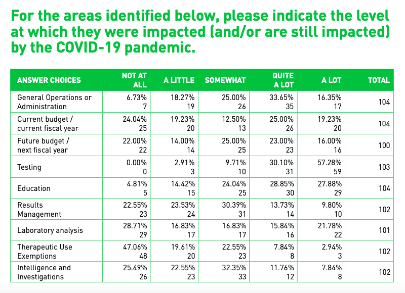 A total of 103 respondents to WADA’s Survey said that testing has been impacted by Covid-19, and 59 of them (57.3%) rated that impact as ‘a lot’ (see right). Fourteen of 70 ADOs had adjusted their test distribution plans (TDPs) as a result of the pandemic, and inability to continue a testing programme was flagged as the major concern by ADOs.