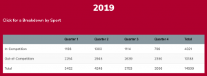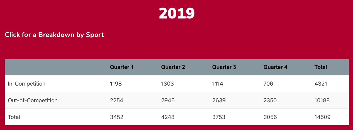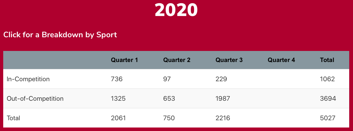 For ADOs, comparing 2020’s testing statistics to previous years is problematic. For example, the international ski federation (FIS) resumed testing in April after a short break. As such, it recorded the number of tests reported from then until December. These cannot be meaningly compared to its 2019 statistics, which run from 1 May 2019 until April 2020.