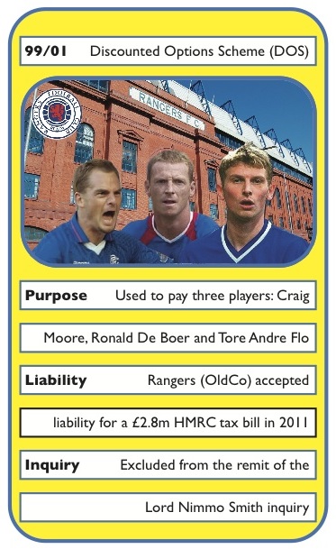 Annexed evidence (PDF below) published by The Offshore Game (TOG), an offshoot of the Tax Justice Network (TJN), reveals that Rangers PLC had been in discussion with HMRC about its Discounted Options Scheme (DOS) since 2000. The DOS scheme created offshore shell companies which were invested in by the Rangers Employee Benefits Trust (REBT), which was created in 1999. In return, the REBT would have the option to take control of the shell companies in the future. This made them technically worthless to anyone other than the REBT, however REBT would allow its option to take control of the companies to expire, passing ownership of the company – and the money invested in it – to Rangers players.