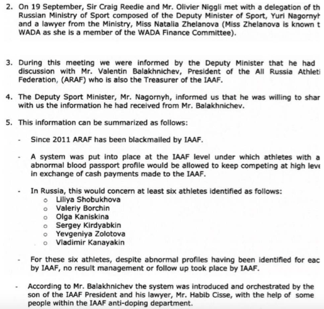 The memo refers to five of the six Russian athletes mentioned above. WADA President Sir Craig Reedie and Director General Olivier Niggli represented WADA at that meeting. It was referred to, and reproduced, in evidence provided by WADA to the IAAF Ethics Board in November 2014.