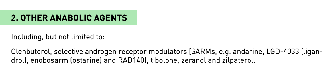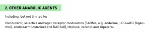 The section of the Prohibited List covering all SARMs names ostarine, but not S-23 (click to open)…