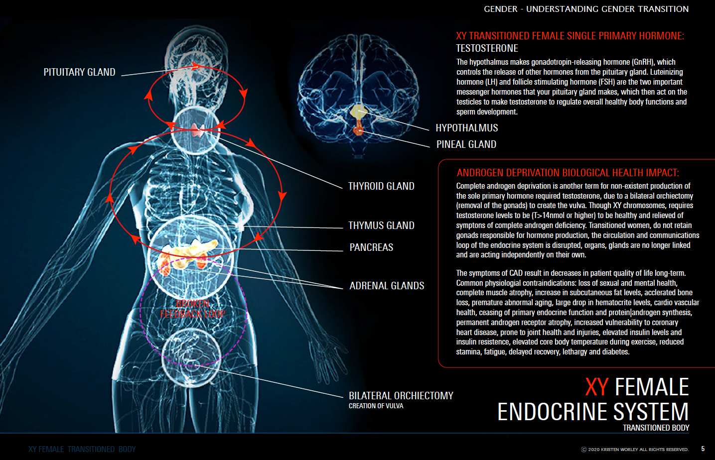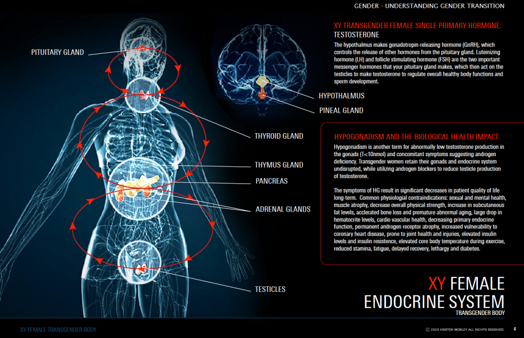 Sex reassignment surgery involves the complete removal of the testicles (castration), the organ responsible for the primary production of testosterone in XY bodies. Losing the ability to produce the body’s primary hormone results in a complete disruption of the endocrine system, disabling the brain’s ability to communicate with vital body organs and carry out vital internal communications that ensures many of the body’s glands and organs work collectively and properly to ensure an athletes health, recovery and performance on the ‘field of play’. Removing testosterone from that system severs the links between those organs and glands, throwing the body into a state of complete androgen deprivation.