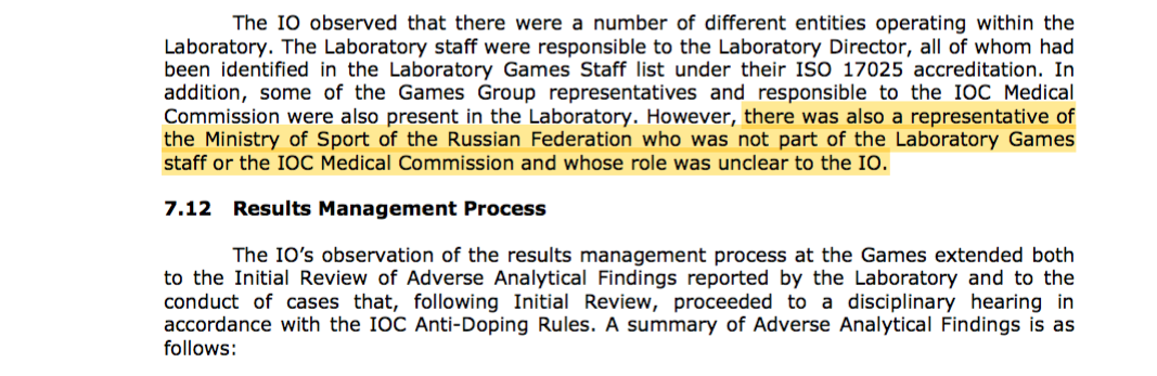 WADA’s alarm bells should have rung when Russia reported not a single adverse analytical finding at the London 2012 and Sochi 2014 Olympic Games. They might have rung again when the Sochi 2014 Independent Observer Report found that the Ministry of Sport had interfered with the Sochi 2014 Laboratory.