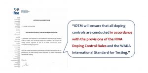 The 2018 annual Letter of Authority issued by FINA to IDTM contained an almost identical sentence (see right). The applicable FINA rules are the 2017 version FINA Doping Control Rules12, which stipulate that doping controls ‘shall be conducted in conformity with the provisions of the International Standard for Testing and Investigations and any protocols of FINA supplementing that International Standard’. One such protocol requires the Doping Control Officers to present, as part of the notification process, the following FINA Doping Control Authorisation, which contains information on the authorisation period, the name of the athlete, the identity of the doping control officers, etc.