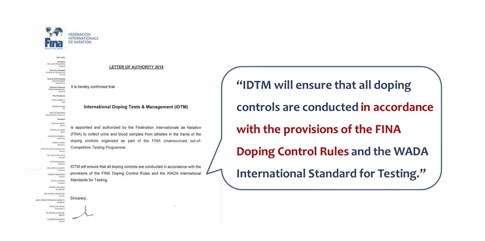 Although FINA’s specific authorisation had been used by IDTM on multiple occasions, WADA’s Counsel argued that its presentation didn’t engage the protocols of FINA, as the testing mission was following the rules of the International Testing Agency (ITA), which was managing the sample collection for FINA13. ITA is not a sample collection subcontractor like IDTM; instead, it is a non-profit foundation, promoted by the International Olympic Committee (IOC) and supervised by WADA, tasked with implementing anti-doping programmes for international sports federations and other anti-doping organisations. Where ITA acts on behalf of FINA, as clearly stated in the signature block of the FINA Letter of Authorisation on the right, the rules of ITA become the protocols of FINA. Even if ITA does not have special status, the principles on agency law will support the same conclusion.