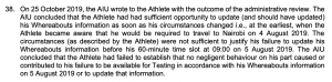 On 5 August 2019, the DCO failed to locate Kipketer, and was later told that he had to travel to Nairobi due to his son being unwell. His explanation included a bus receipt and itinerary detailing travel from Eldoret to Nairobi, as well as a medical certificate. However, the AIU ruled that he had ample time in which to update his whereabouts (see right).