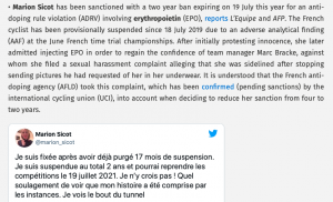 ‘We stay convinced that Marion Sicot’s accusations against Marc Bracke have no other intention than to obtain a reduced suspension for her use of doping, in which she has succeeded’, reads the statement (below), adding that a defamation claim has been filed with French courts. ‘We remark that Marion Sicot’s complaint against Marc Bracke was made only 8 months after she was informed to be caught for doping and after she had denied her use of doping for months with a series of the most unbelievable explanations’.