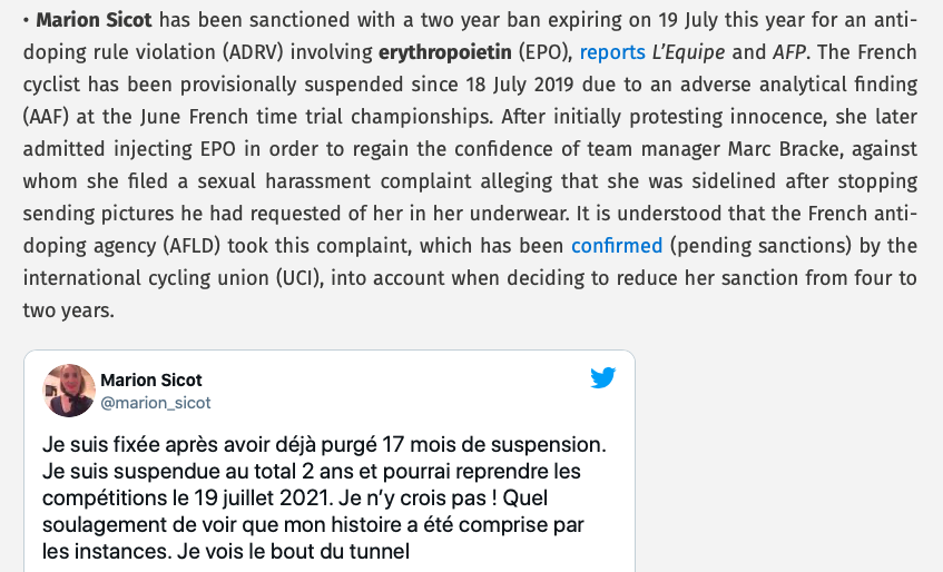 ‘The UCI has a responsibility to ensure a respectful environment for stakeholders and must condemn such damage to the reputation of the rider Marion Sicot. The UCI Disciplinary Commission made it very clear in its decision that the matter concerned the behaviour of Mr Bracke towards the complainants and any references to the reputation of the riders who denounced his conduct or the context in which such denunciations were made are of no relevance for the assessment of the fact’.