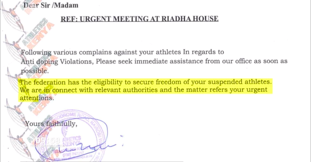 However, although Athletics Kenya may not have had the authority to interfere with anti-doping results management, this isn’t proof that rogue officials didn’t write to athletes claiming to have such authority. In circumstances where an official might be attempting to extort money from an athlete, one might argue that fabricating a fake official seal might be a sensible move.