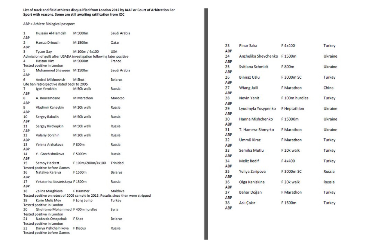 #Athletics As promised, the list of athletes DQ from London 2012 for doping.