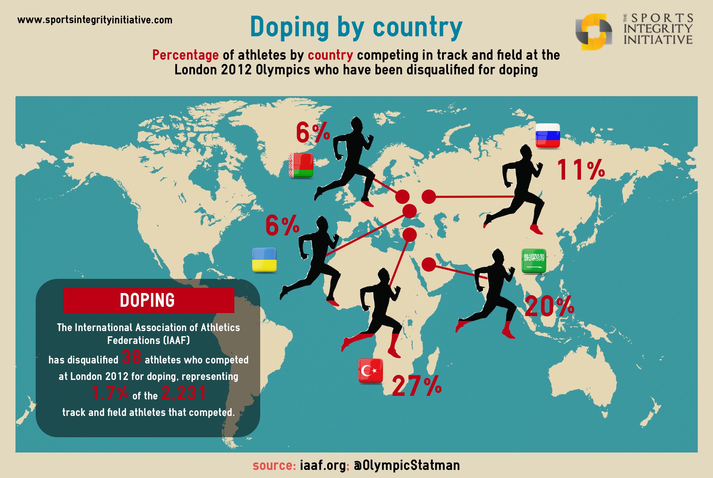 The International Association of Athletics Federations (IAAF) has disqualified 38 athletes who competed at London 2012 for doping, representing 1.7% of the 2,231 track and field athletes that competed. Russia led the field with 11 athletes disqualified, closely followed by Turkey with nine disqualifications. They were followed by Ukraine and Belarus, with five and three disqualifications, respectively. However, as Russia sent 97 athletes to London, only 11% of its athletes have been disqualified for doping. This compares to 27% for Turkey and 20% for Saudi Arabia, where two of the ten athletes the kingdom sent to London were disqualified.
