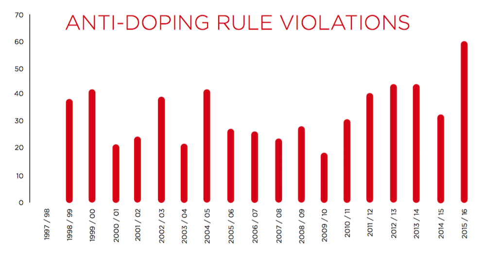 During the 2016 financial year, the 60 ADRVs represented 1.6% of the 3,820 tests conducted. During the 2015 financial year, the 30 ADRVs represented 1.1% of the 2,760 tests conducted.