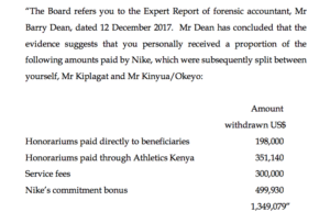 • Nike claimed that the ‘Honorariums’ were to cover the travel costs of officials, but investigators found that Athletics Kenya covered the travel costs of their officials;