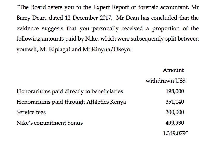 • 16 payments totalling US$1.226 million were paid in ‘Honorariums’ and Service Fees by Nike to Athletics Kenya between December 2004 and December 2012. Such payments were deposited into a ‘Clearance Account’ and did not appear in Athletics Kenya’s financial statements;