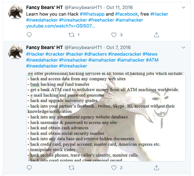 • Australian swimmer Shayna Jack has taken down her social media accounts after hackers threatened her and posted messages on her Facebook account, reports the Daily Telegraph. It is understood that hackers from a ‘different country’ threatened to post pictures of her unless money was paid, and posted Facebook messages on her behalf. Jack is understood to have reported the incident to the Queensland Police and the Court of Arbitration for Sport (CAS). Jack is appealing a four year ban at the CAS after blaming a Lingradol (LGD-4033) adverse analytical finding (AAF) on contaminated supplements. Fancy Bears, a hacking team found to involve agents of the Russian State, has advertised methods of hacking into social media accounts on its Twitter page (see right).