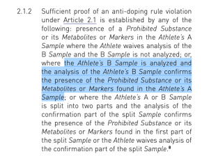 Even when the A and B samples don’t match, an athlete can still be charged with an ADRV. They cannot be charged with ‘presence of a Prohibited Substance or its Metabolites or Markers’ under Article 2.1 of the World Anti-Doping Code, which requires any analysis of the B sample to confirm the result from the A sample analysis (see right).
