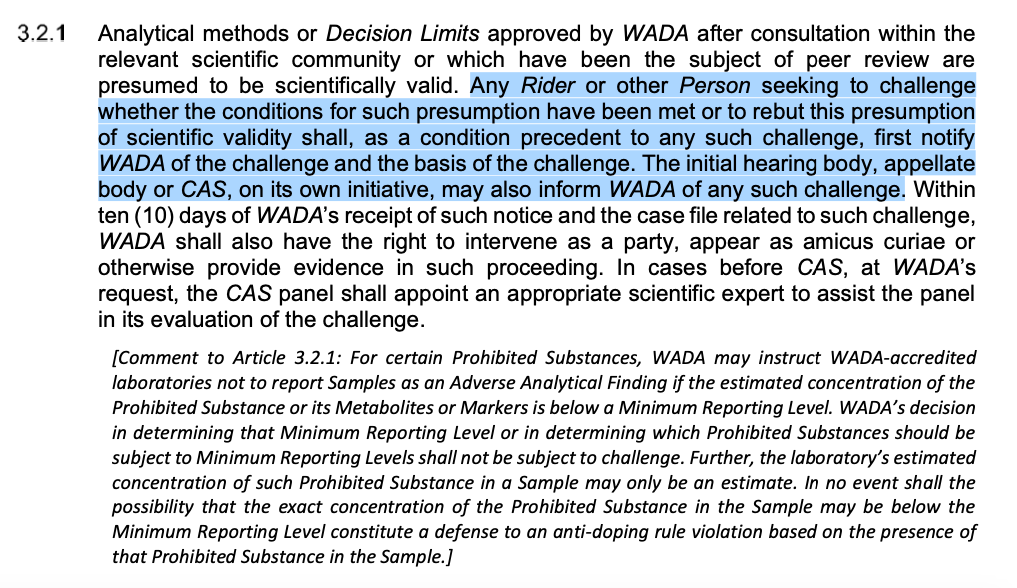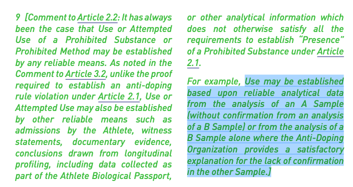 However, an athlete can be charged with ‘use or attempted use’ of a prohibited substance or method under Article 2.2 of the Code, even when the samples don’t match. This is spelled out in a comment to Article 2.2 of the Code (see left). As Cardoso’s B sample was flagged as a ATF, this allowed the UCI to charge him with ‘use or attempted use’, as it could claim to have met the requirement for a ‘satisfactory explanation for the lack of confirmation’ in the B sample.