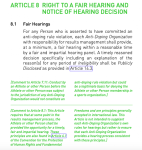 Interestingly, the Athlete Guide also outlines an athlete’s right to a fair hearing, as guaranteed by Article 8.1 of the Code (see right). The UCI didn’t grant Cardoso a hearing.