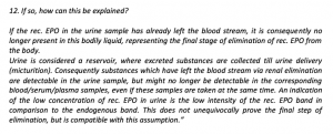 Dr. Günter Gmeiner and Dr. Christian Reichel of the WADA accredited Austrian Laboratory explained that if EPO had left the bloodstream, it could still be detected in the ‘reservoir’ of urine until excreted. This Opinion was filed by the UCI on 8 September 2017 and in its 15 November 2018 Decision, the UCI’s ADT found that it met the threshold of ‘comfortable satisfaction’ required to accept it (see right).