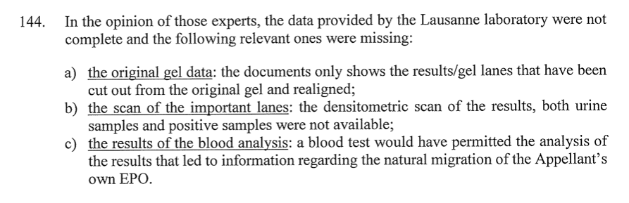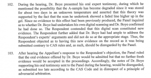 Again, the eagle eyed may have spotted an anomaly. Evidence from Cardoso’s experts that the A sample may have degraded wasn’t accepted for procedural reasons. Yet the difference between the A and B sample was explained via degradation of the B sample.