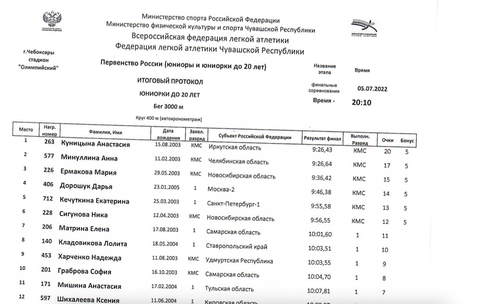 Sofia Grabova (София Граброва) was sanctioned with a three year ban after a sample taken on 14 July returned an adverse analytical finding (AAF – or ‘positive test’) for Erythropoietin (EPO). The 18 year old finished tenth in the u20 3,000m at the Russian Junior Championships, which took place on 5 July (see right). ‘All results from the date of the positive sample are cancelled’, read a Statement from the Russian Athletics Federation (RusAF), meaning that Grabova will keep her tenth place finish at the Russian Juniors.