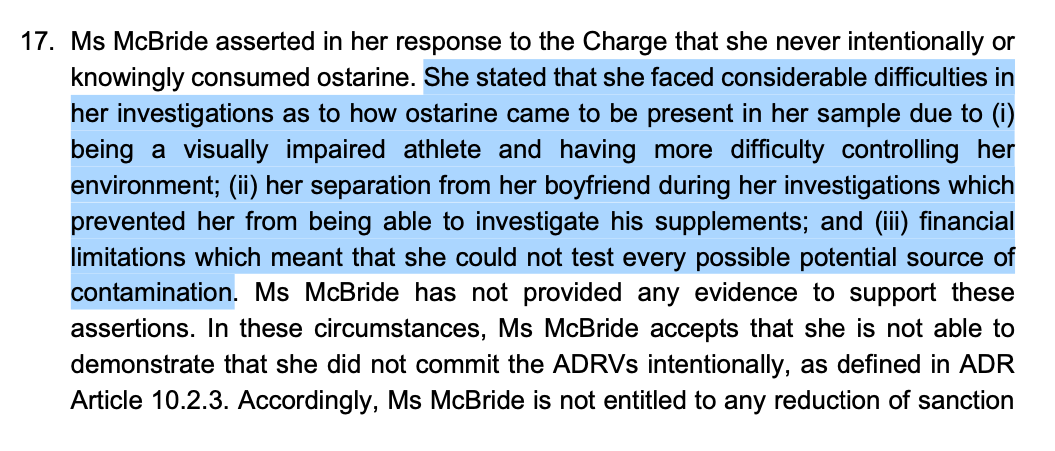 She argued that as she is visually impaired, she had difficulties in controlling her environment; that her separation from her boyfriend had prevented her from investigating any supplements he was using; and that her financial situation made it difficult to investigate every possible source of contamination. Threatened with a four year ban, she ‘admitted’ an ADRV she asserts she never intentionally committed in order to claw one year of her career back.