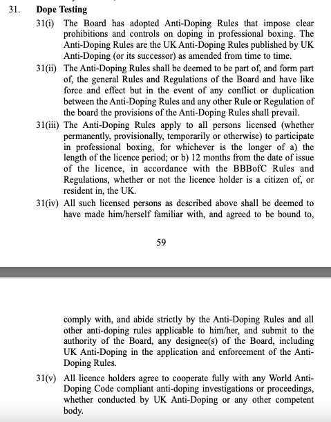 Unfortunately for the fight’s promoters, the British Boxing Board of Control (BBBoC) disagreed, and withdrew its sanctioning of the bout (see below). Because prize fighting bodies are not signatories to the World Anti-Doping Code, the reasons why are unusually complicated.