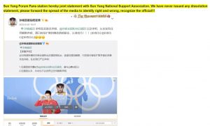 While some peripheral reporting around such a high profile case is to be expected, some of these reports were deeply deceptive. There are two major fan organisations in China: The Sun Yang National Support Association, which currently has 155,148 members, and the Sun Yang Forum Fans Club, which currently has 43,939 members. These organisations issued a joint statement denying the false reports (see right). With ready access to China, how does Jonathan White at The South China Morning Post explain such misleading reporting? As admitted in the SCMP report, Sun Yang has over 33 million followers on Chinese social media network Weibo.