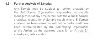 “All British elite athletes who are part of UKAD’s whereabouts testing and/or reanalysis programme will be under the jurisdiction of UKAD even if they are overseas training or competing”, read a 4 March 2017 statement from UKAD CEO Nicole Sapstead, reposted on its internet site today. “Their samples will be tested and potentially reanalysed by UKAD based on intelligence received and improvements in detection methods. Each time a sample is reanalysed or sent to another location, the amount contained within a sample can be reduced or has the potential to degrade which limits the possibility to test again in the future.