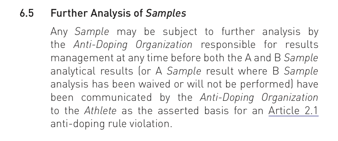 As shown, Article 6.5 of the World Anti-Doping Code mandates that the anti-doping organisation responsible for results management – in this case UKAD – is responsible for any retesting. Sapstead never told The Guardian that UKAD would oppose the transfer or retesting of samples, only that credible evidence was needed before the samples would be transferred in order to protect Farah’s samples from degradation. Such degradation may scupper any retesting using new methods in the future.