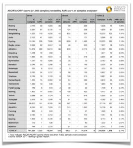 In a ‘Questions and Answers’ document (PDF below) published alongside the Report, WADA states that there has been an increase in the number of AAFs from the application of the ESA test to blood samples. Whilst this is true, the percentage of AAFs from the application of the ESA test to blood samples remained the same as last year.